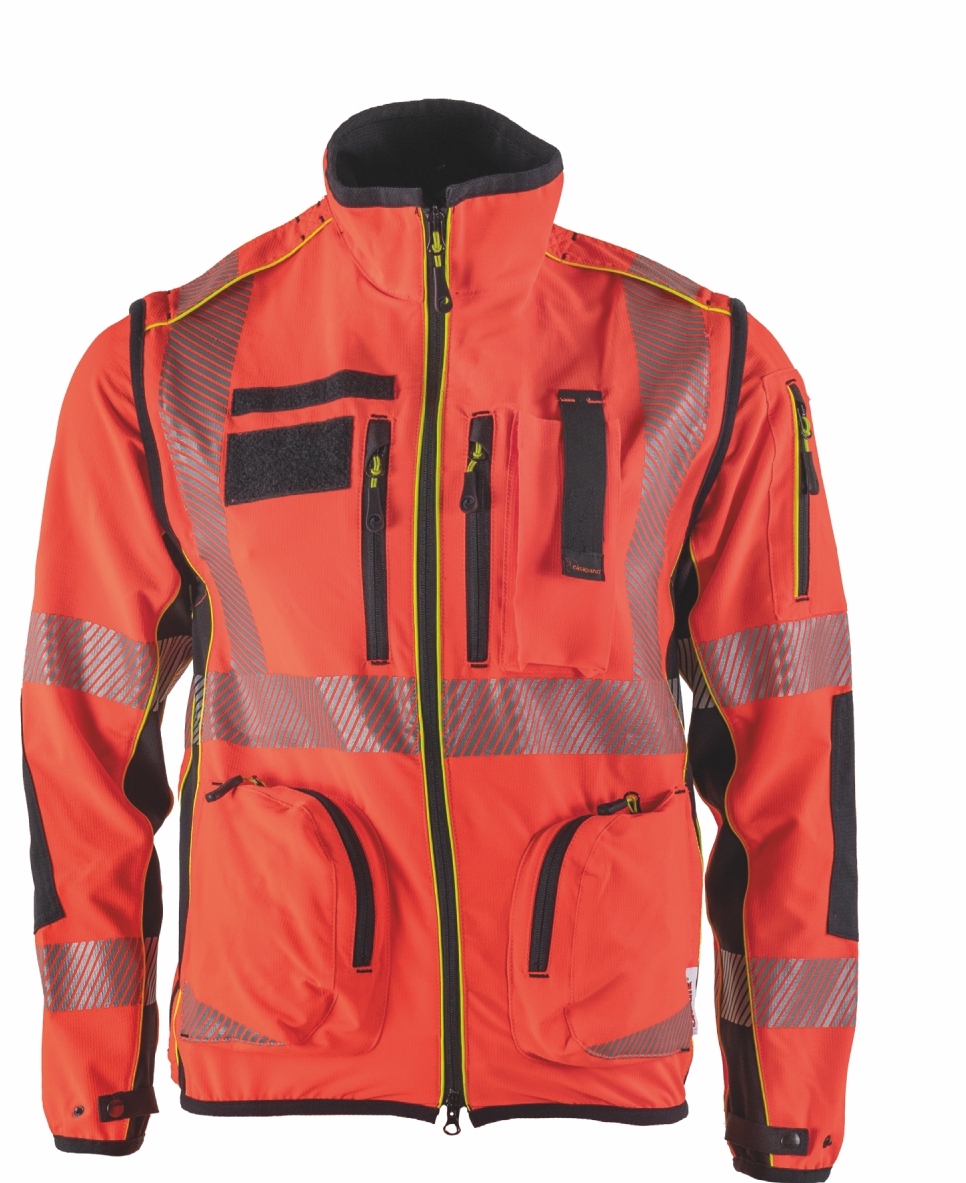 Giacca da lavoro alta visibilità in tessuto tecnico arancione fluorescente con inserti neri e dettagli riflettenti. Il design è pensato per garantire sicurezza e comfort durante le attività all’aperto o in ambienti con scarsa illuminazione.